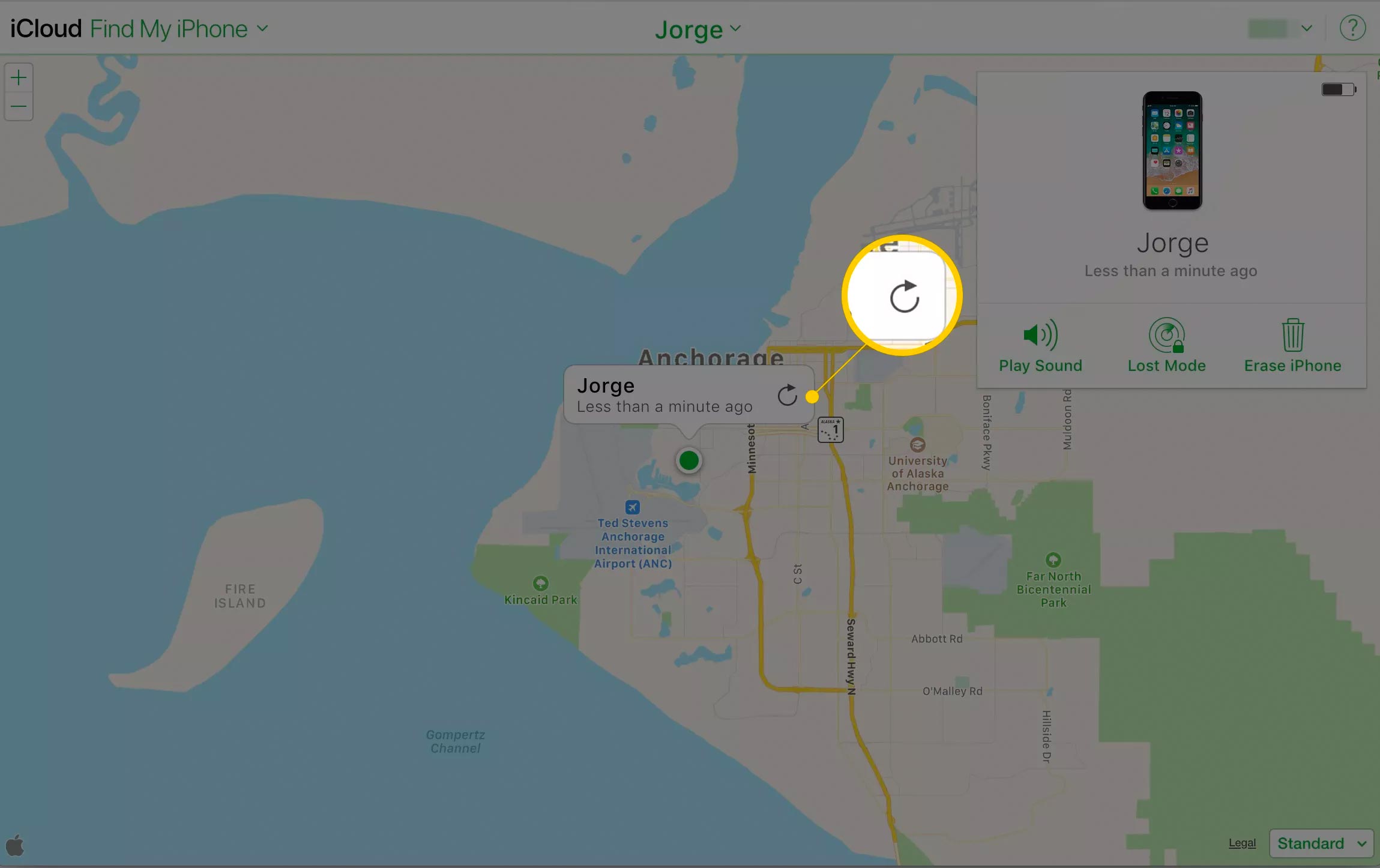- Hvis du tror enheten din er i bevegelse kan du trykke på den grønne prikken som representerer telefonen din. Klikk deretter på pilen i det neste vinduet for å oppdatere telefonens plassering ved hjelp av de seneste GPS-dataene.